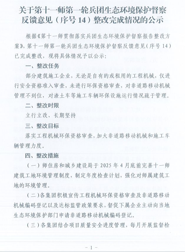 关于第十一师第一轮兵团生态环境保护督察反馈意见(序号14)整改完成情况的公示