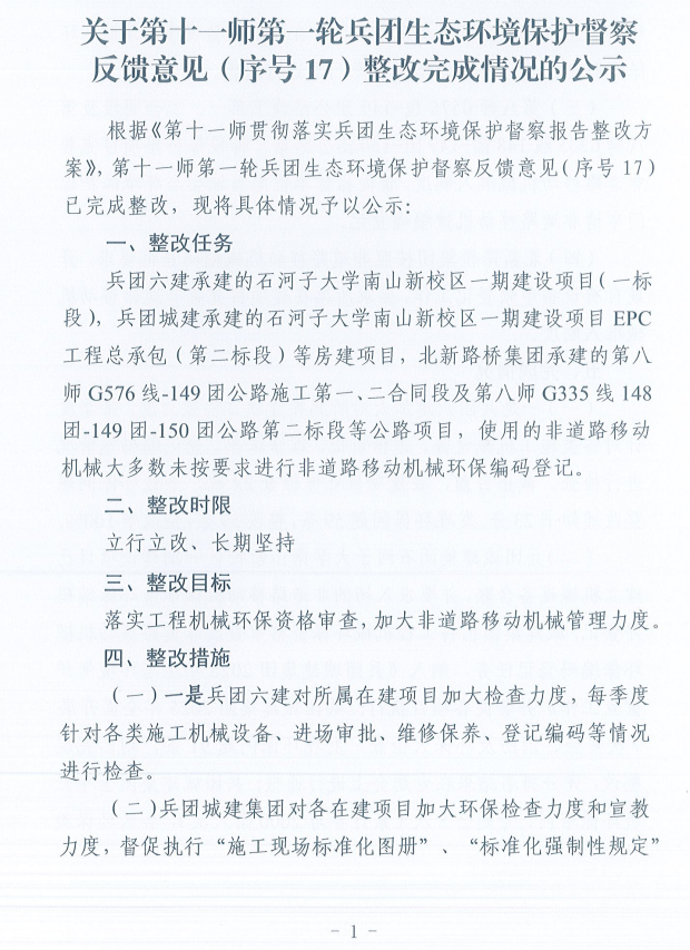 关于第十一师第一轮兵团生态环境保护督察反馈意见(序号17)整改完成情况的公示